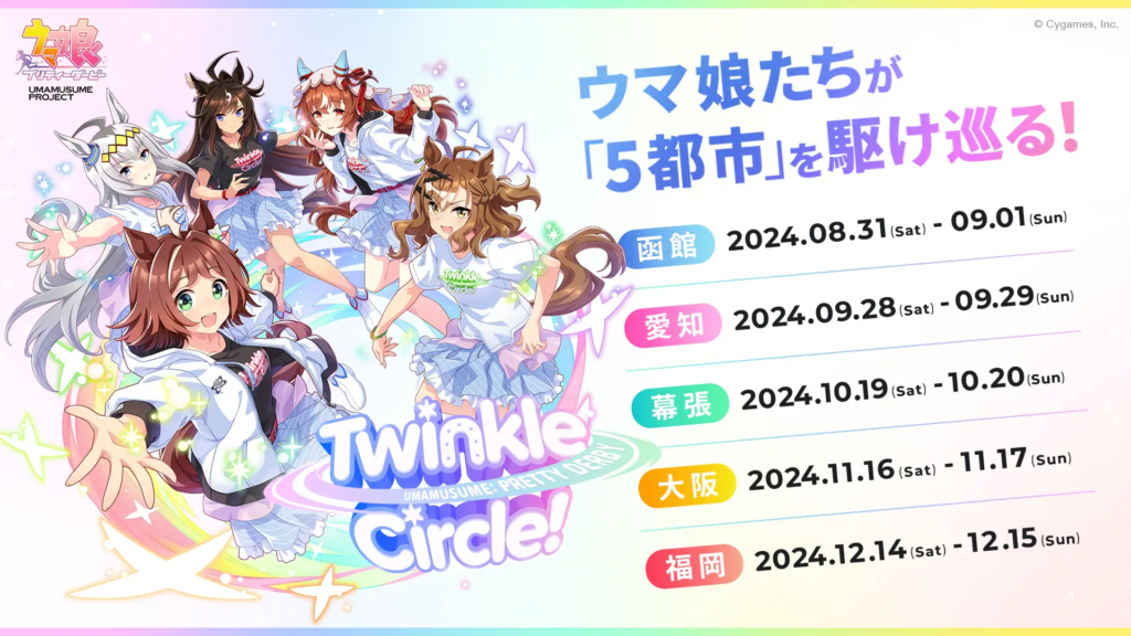 「ウマ娘 プリティーダービー Twinkle Circle!」は5都市を駆け巡る大規模なイベントにゃ!ライブやトークショー、バラエティコーナーでウマ娘たちの魅力を存分に楽しめるにゃ!みんなで一緒に「Twinkle Circle!」を楽しもうにゃ!猫戸もワクワクして待ちきれないにゃ!