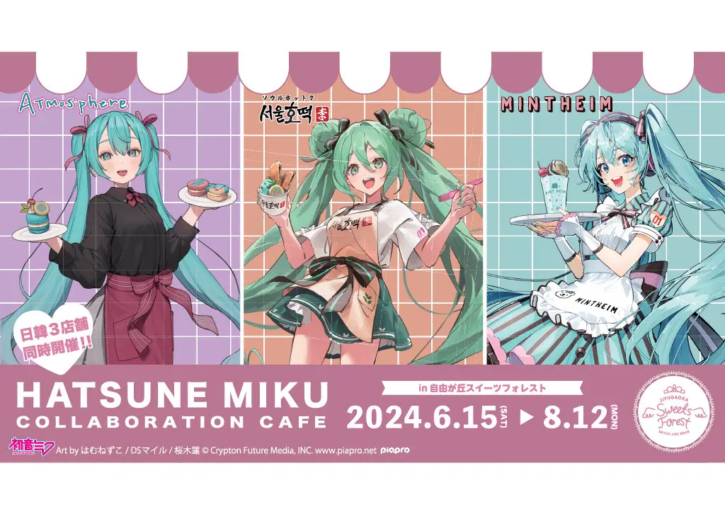 2024年6月15日から8月12日まで、東京・自由が丘スイーツフォレストと韓国のソウルで、初音ミクと韓国の人気カフェ3店舗のコラボカフェが開催されるにゃ!ソウルの3店舗は、若者に大人気のアートな街「弘大(ホンデ)」の「Atmosphere」、「新村(シンチョン)」の「ソウルホットク」、そしてミントチョコ専門店の「MINT HEIM」だにゃ。どれも美味しそうでワクワクするにゃ~!