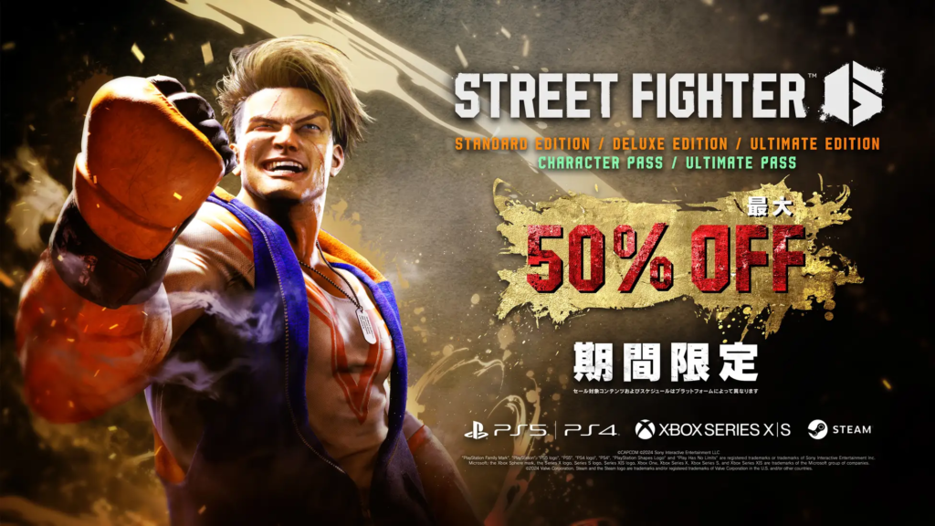 今、『ストリートファイター6』のダウンロード版が50%オフとお得に購入できるにゃ!「スタンダードエディション」「デラックスエディション」「アルティメットエディション」の各バージョンが対象になっているから、まだプレイしていない人はこの機会にぜひ手に入れてほしいにゃ!
