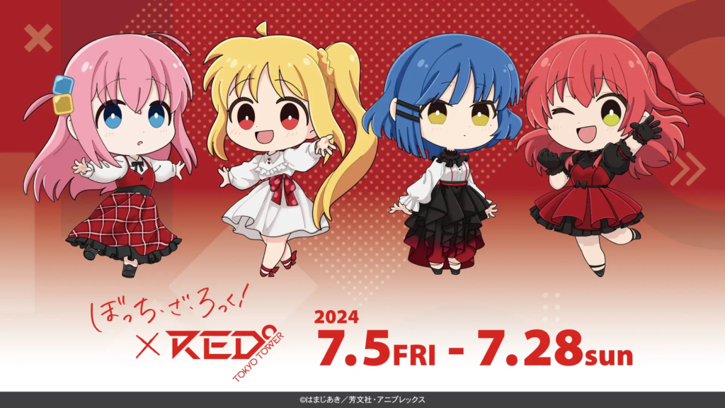 まずはコラボイベントの基本情報を紹介するにゃ。アニメ「ぼっち・ざ・ろっく!」とRED° TOKYO TOWERのコラボイベントは、2024年7月5日(金)から7月28日(日)まで開催されるにゃ。場所はもちろん、RED° TOKYO TOWERだにゃ!