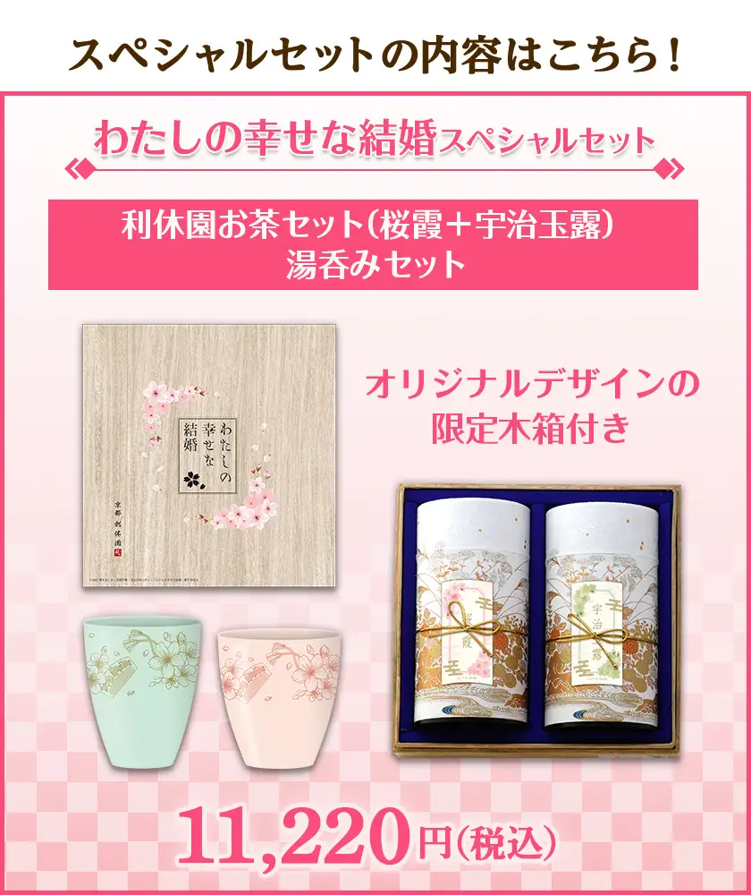 「桜霞」と「宇治玉露」、そしてオリジナルグッズがセットになった「わたしの幸せな結婚スペシャルセット」は、STORESにて販売されるにゃ。予約は2024年6月14日から始まって、7月15日まで受け付けているんだにゃ。早めに予約して、特別なお茶を楽しんでほしいにゃ!