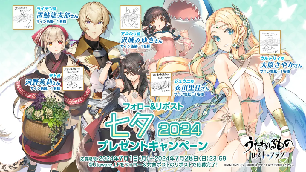 『うたわれるもの ロストフラグ』公式X(旧Twitter)では、復刻イベントを記念してフォロー&リポストキャンペーンが開催されるにゃ!今回の賞品は豪華声優陣5名の「直筆サイン色紙」だにゃ!