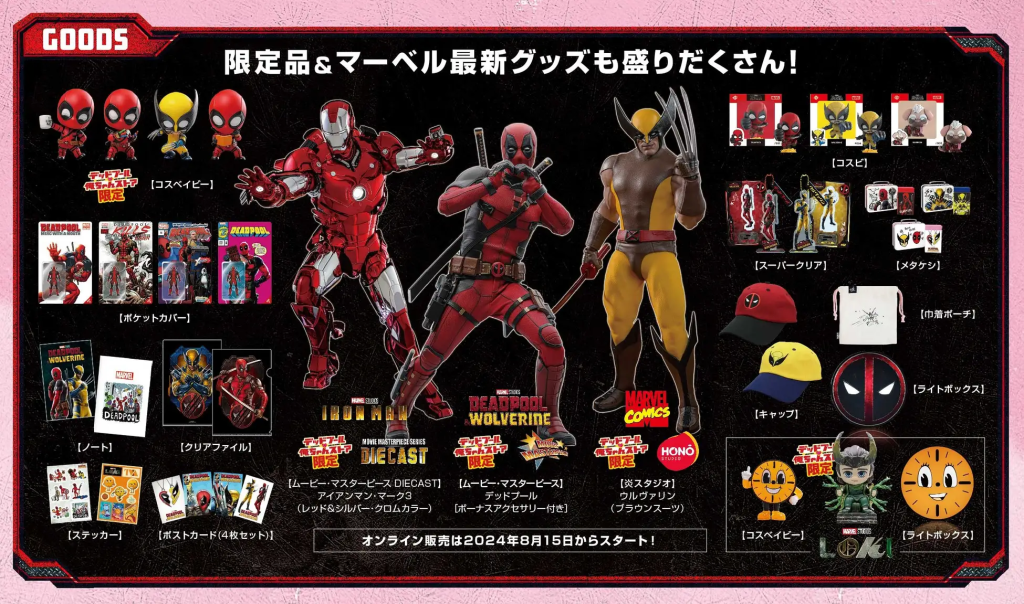 イベント限定アイテムも多数ラインナップされるにゃ!デッドプールの1/6スケールフィギュアは一般販売に先駆けてボーナスアクセサリー付きで数量限定販売されるから、ファンは見逃せないにゃ!他にもライトボックスやデフォルメフィギュア「コスビ」、アパレルやステーショナリーなど幅広い関連アイテムが揃っているにゃ!