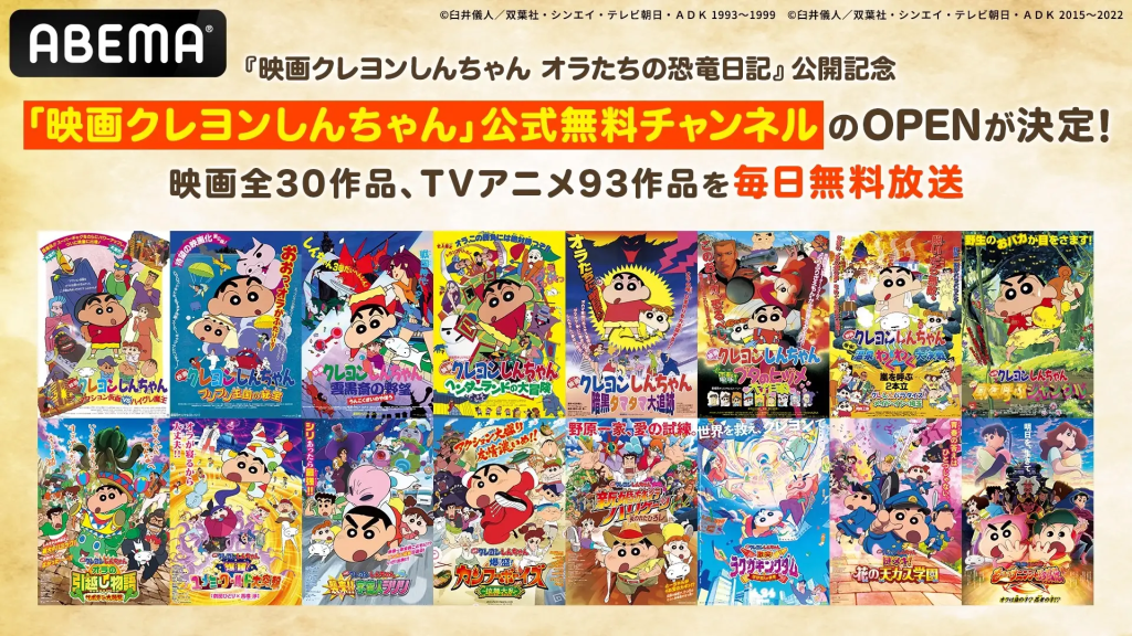 新しい未来のテレビ「ABEMA」は、『クレヨンしんちゃん』の最新作『映画クレヨンしんちゃん オラたちの恐竜日記』の公開を記念して、2024年7月22日(月)より、「映画クレヨンしんちゃん」公式無料チャンネルをOPENするにゃ!このチャンネルでは、『クレヨンしんちゃん』の映画30作品とTVアニメの93エピソードが、毎日ノンストップで無料放送されるんだにゃ!