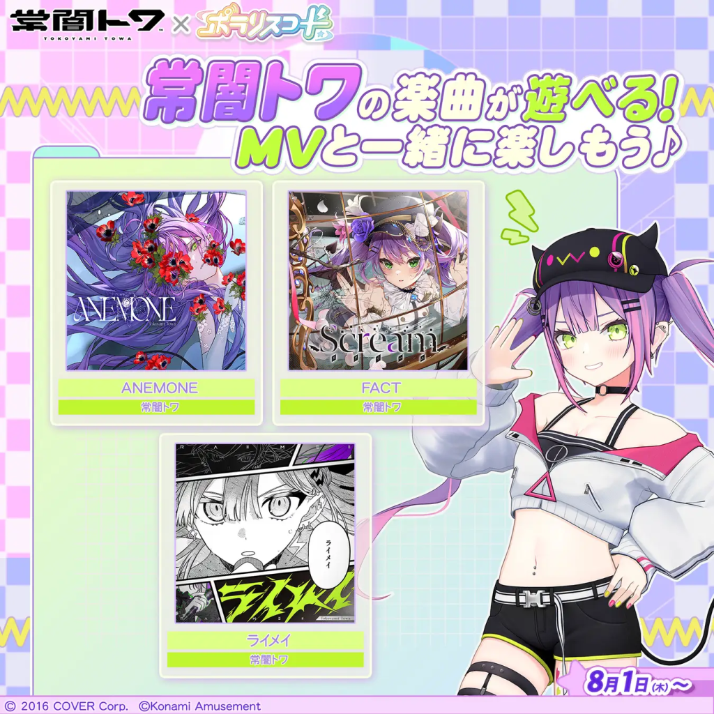 今回のコラボでは、『常闇トワ』ちゃんの人気曲「ANEMONE」、「FACT」、そして「ライメイ」の3曲がゲーム内に収録されるんだにゃ!しかも、上部のモニターで『トワ』ちゃんのミュージックビデオが流れるから、プレーしながら映像も楽しめるんだにゃ。猫戸は「ライメイ」の力強いビートが特にお気に入りだから、早くプレーしてみたいにゃ!
