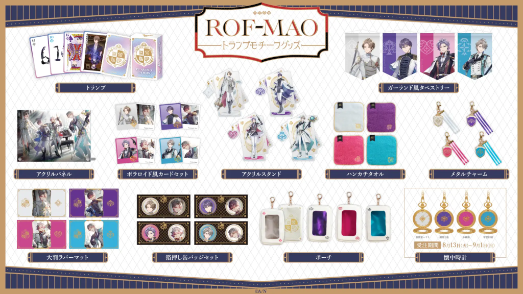 「ROF-MAO トランプモチーフグッズ」は、にじさんじオフィシャルストアで2024年8月13日(火)12時から販売開始にゃ!さらに、全国のアニメイトでも2024年8月17日(土)から2024年9月8日(日)まで「にじさんじ ROF-MAO トランプモチーフグッズ発売記念 フェア in animate」が開催されるにゃ!詳細は【にじさんじオフィシャルストア】や【アニメイト特設ページ】をチェックしてにゃ!