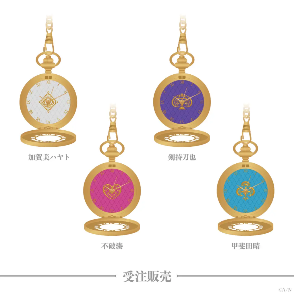 最後は受注販売の懐中時計にゃ!価格は各9,000円(税込)で全4種。受注期間は2024年8月13日(火)12時から2024年9月1日(日)23:59までにゃ!本体のサイズはφ47mm、チェーンは15cmで、亜鉛合金と鉄でできてるから高級感たっぷりにゃ!お届けは2025年1月中旬以降だけど、待つ価値は十分にあるにゃ!