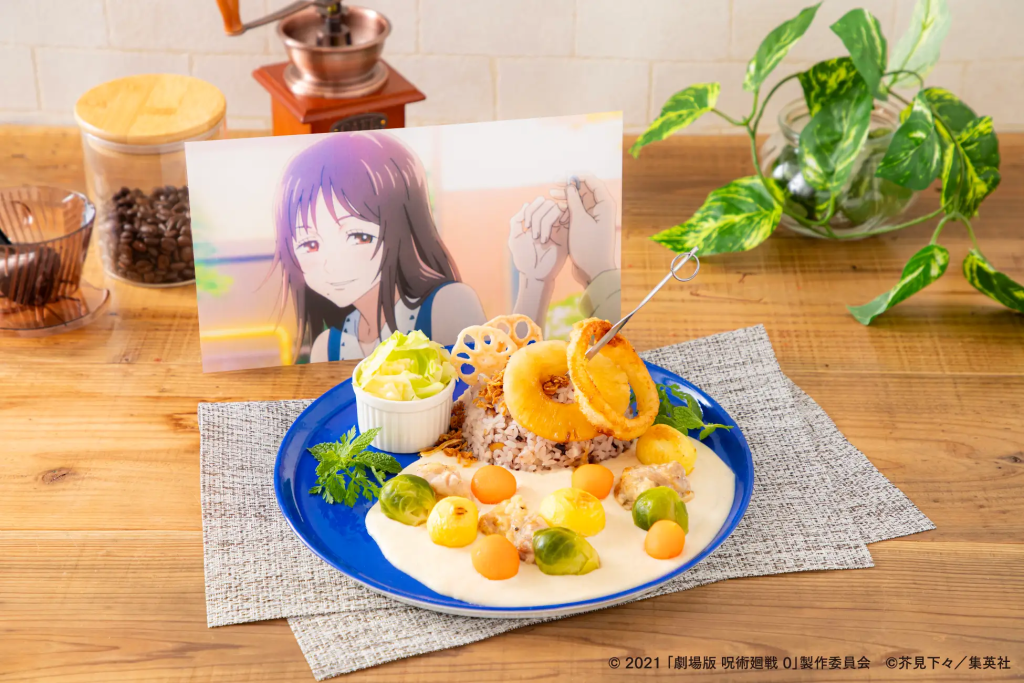 - 【乙骨憂太】なかよしホワイトカレー: 真っ白なカレーにオニオンリングやパイナップルが乗ってるにゃ。乙骨ちゃんの好物、塩キャベツもついてるにゃ。