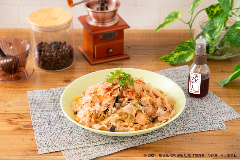 - 【狗巻棘】おにぎりの具パスタ: 狗巻ちゃんといえばおにぎり!パスタにシャケやおかかが盛り付けられてるんだにゃ。