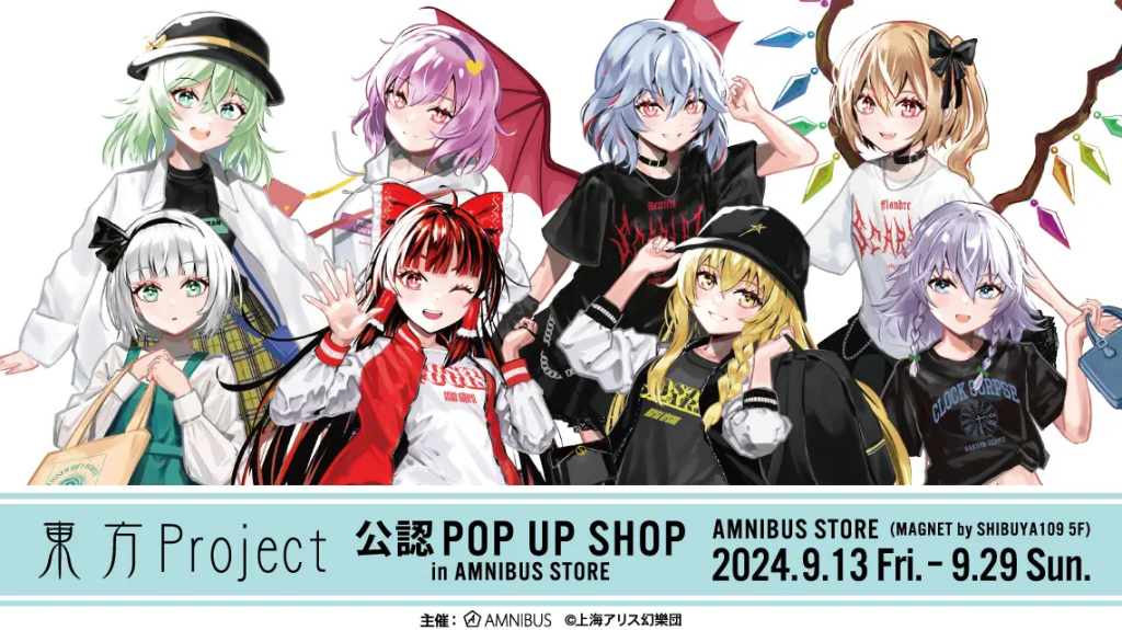 まずはイベントの基本情報からにゃ!2024年9月13日(金)から9月29日(日)まで、渋谷のMAGNET by SHIBUYA109 5Fにある「AMNIBUS STORE」で『東方Project』公認のPOP UP SHOPが開催されるんだにゃ!猫戸もお友達と一緒に行きたくてうずうずしてるにゃ!