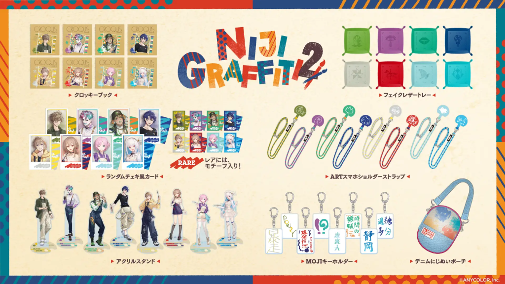 「NIJI GRAFFITI 2」は、にじさんじのライバーちゃんたちが、お絵描きをテーマにしたグッズを展開してるシリーズにゃ!第1弾も大人気だったけど、第2弾はさらにパワーアップ!オーバーオール姿でお絵描きするライバーちゃんたちのキュートなビジュアルを使ったアイテムが登場にゃんだって!