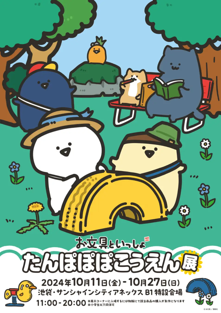 癒し系キャラクター「お文具さん」の展覧会について紹介するにゃ!その名も「お文具といっしょ たんぽぽぽこうえん展」!2024年10月11日(金)から池袋のサンシャインシティアネックスで開催されるんだにゃ!お文具さんの優しい世界観が広がる公園がテーマになってるから、気になる人はぜひチェックしてにゃ!
