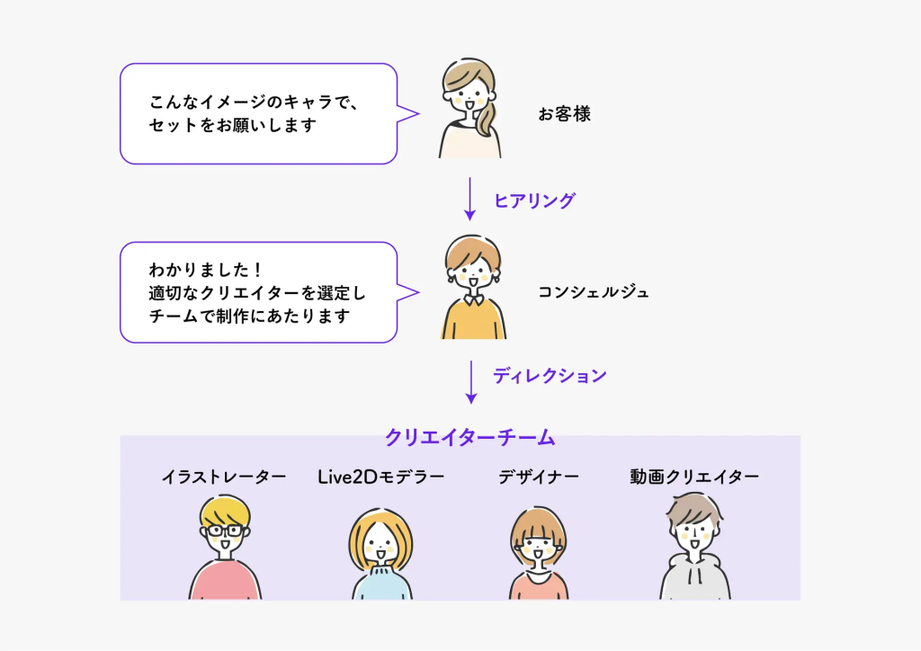初心者の方でも安心にゃ!「どうやって発注したらいいか分からない」とか「クリエイターさんに失礼しちゃったらどうしよう…」なんて心配は不要だにゃ!コンシェルジュがぜ~んぶ代わりにやってくれるから、トラブルの心配は全くなしにゃ。しかも、希望通りのクリエイターさんを選んでくれて、納品までしっかりサポートしてくれるにゃ。安心して任せられるにゃね!
