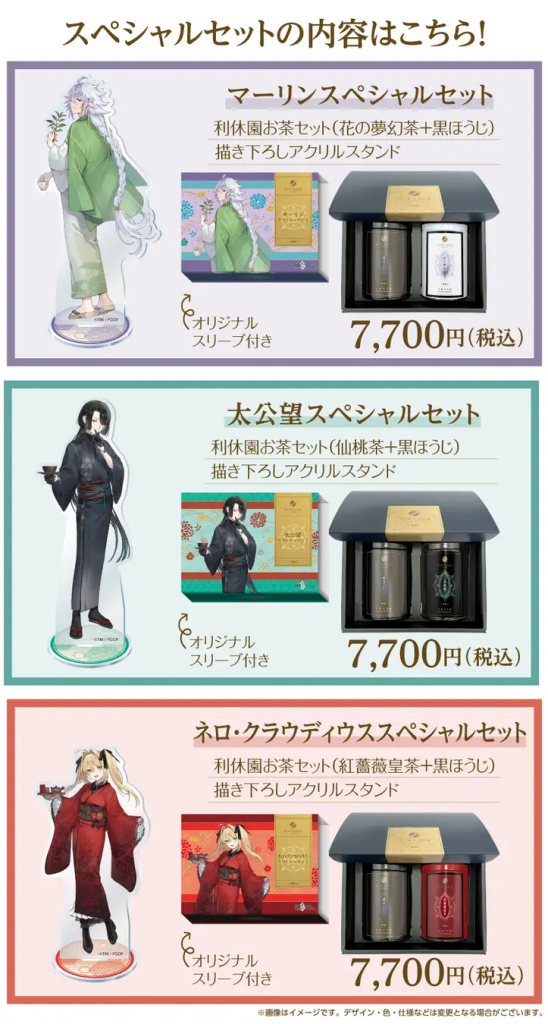 今回のコラボでは、各サーヴァントをイメージしたお茶に加えて、「黒ほうじ」とオリジナルグッズがセットになってるにゃ!これが『千利休がプロデュースしたお茶第2弾』スペシャルセットにゃ~。予約は以下のサイトから可能だよ!