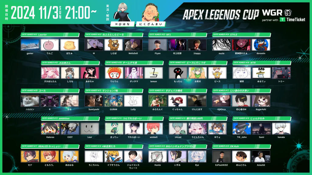 この大会は2024年11月3日(日)21:00から始まる、超本格的なeスポーツ大会なんだにゃ。賞金総額はなんと20万円!これはApex Legends好きにはたまらない魅力だにゃ!しかも、大会の参加者も超豪華なんだって。プロゲーマーはもちろん、俳優ちゃんや有名な配信者ちゃんも参加するんだにゃ!