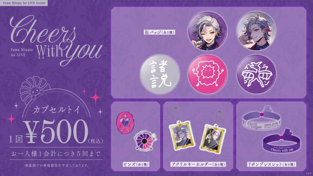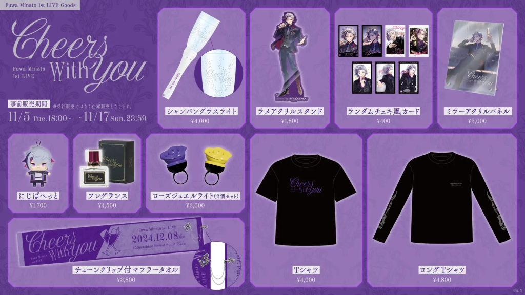 今回は、「にじさんじ」の人気ライバー、不破湊ちゃんの初ライブ「不破湊 1st LIVE “Cheers with you”」の事前グッズ販売がスタートするってことで、ワクワクしながら紹介していくにゃ!どれも素敵で魅力的なアイテムばかりだから、ファンの皆も見逃さないでにゃ!
