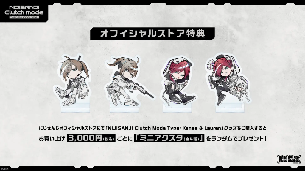 にじさんじオフィシャルストアで、「Clutch Mode Type:Kanae & Lauren」のグッズを税込3,000円以上購入すると、なんとミニアクスタがもらえるんだにゃ!全4種類のランダムなアクスタがプレゼントされるから、何が当たるかお楽しみにゃ~!