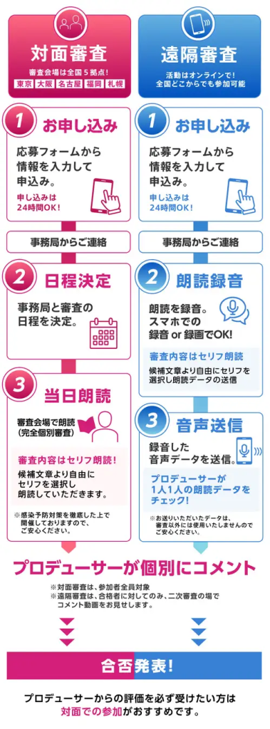 指定された会場で朗読審査を受けるにゃ。会場の雰囲気にドキドキするけど、直接パフォーマンスを見てもらえるのはアピールのチャンスだにゃ!ただし、応募者が多い場合は締め切りが早くなる可能性もあるから、早めに申し込むのがおすすめだにゃ。