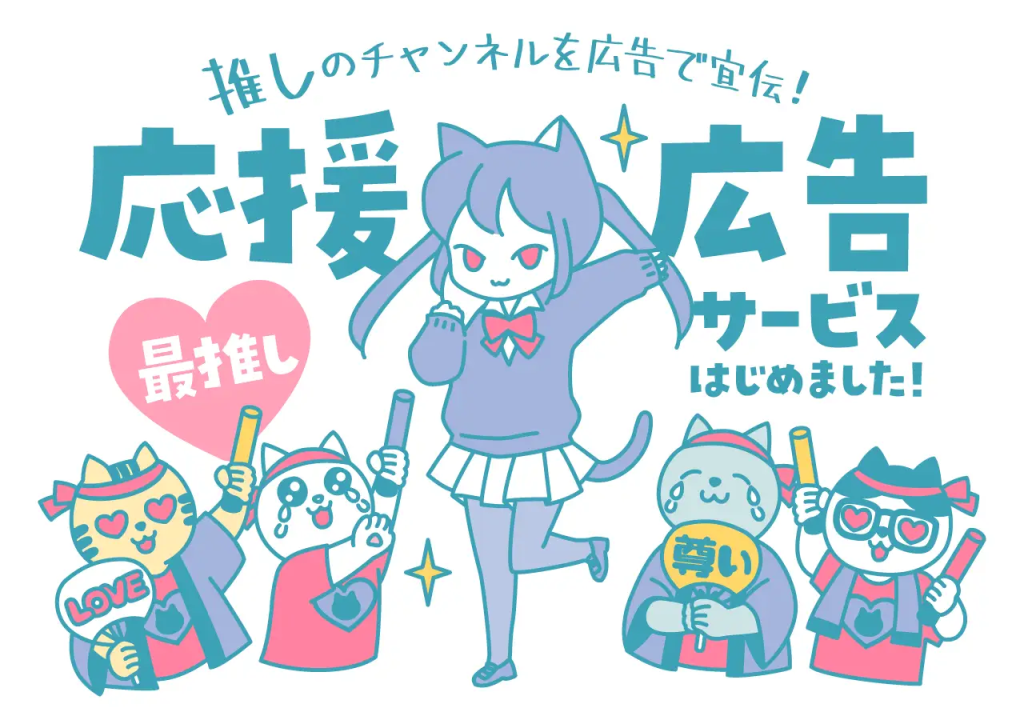 これまでの推し活といえば、コメントや高評価、拡散、メンバーシップへの加入、スーパーチャットなどが主流だったにゃ。でも、この応援広告サービスを使えば、推しの存在や活動をより多くの人に広めることができるにゃ!