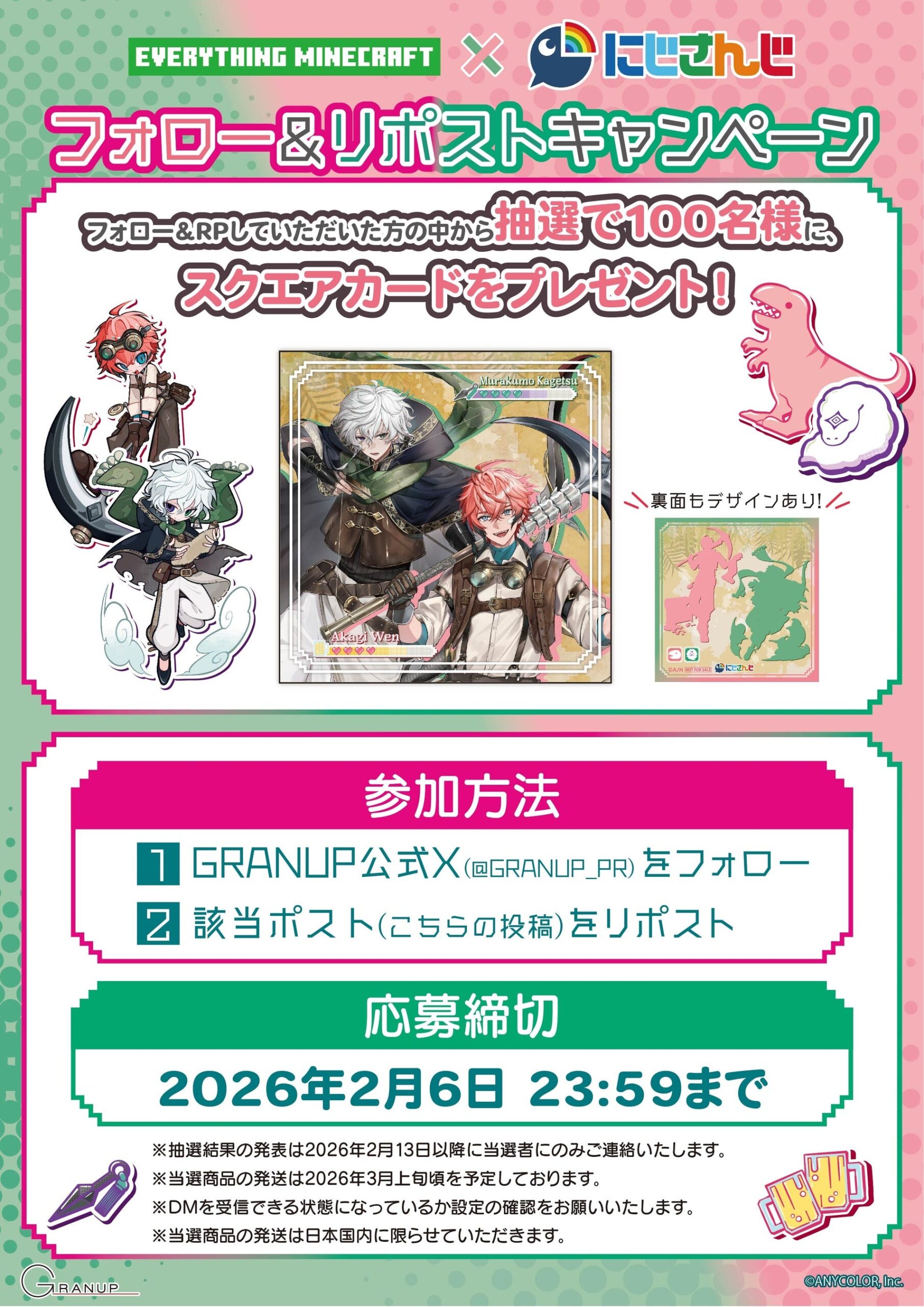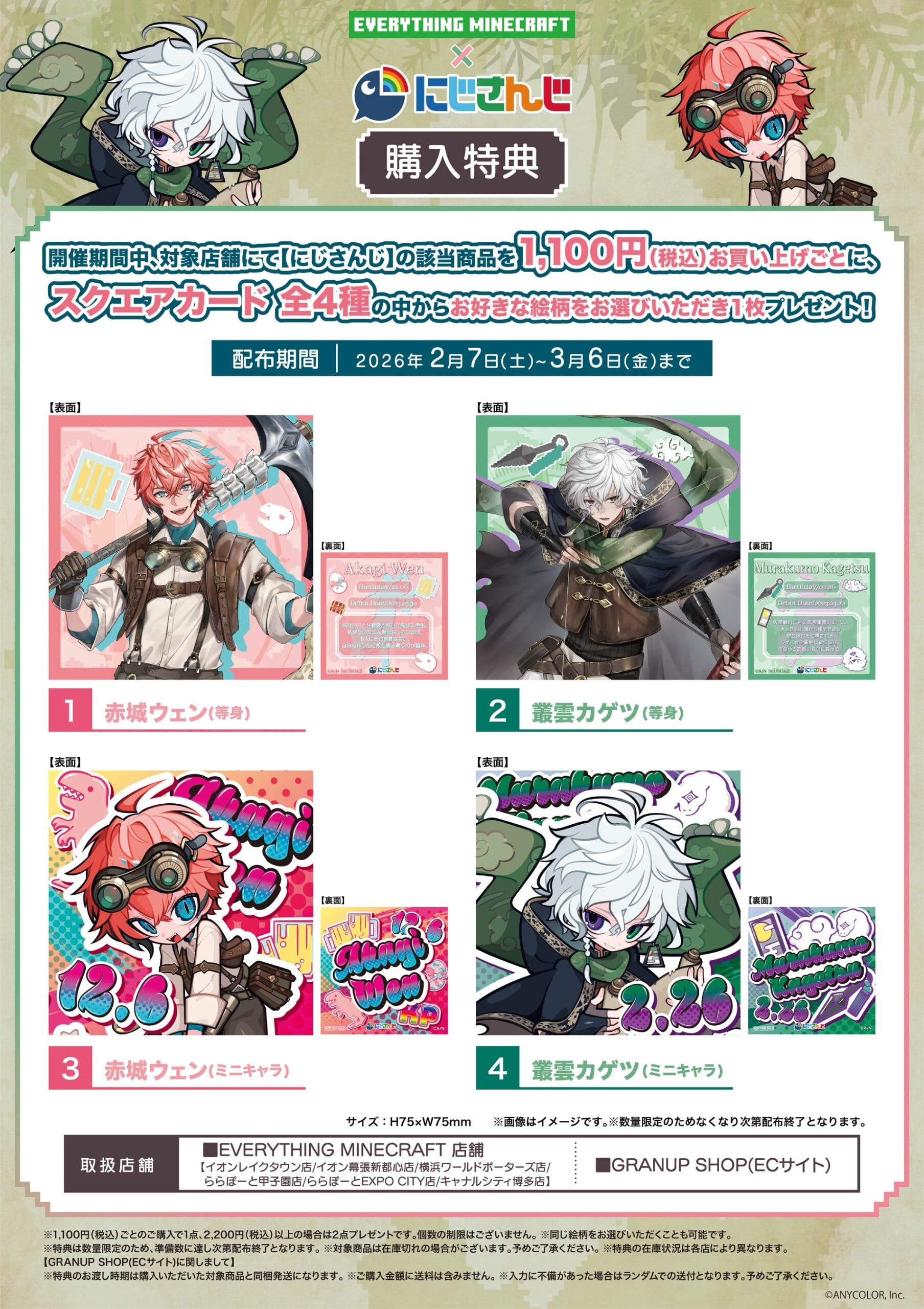株式会社GRANUP(本社:千葉県松戸市、代表取締役:上野綾介)は、運営するEVERYTHING MINECRAFTの特定店舗とGRANUP SHOPにて、にじさんじ所属のVTuber「赤城ウェン」と「叢雲カゲツ」とのスペシャルコラボキャンペーンを2026年2月7日(土)から開始しますにゃ!