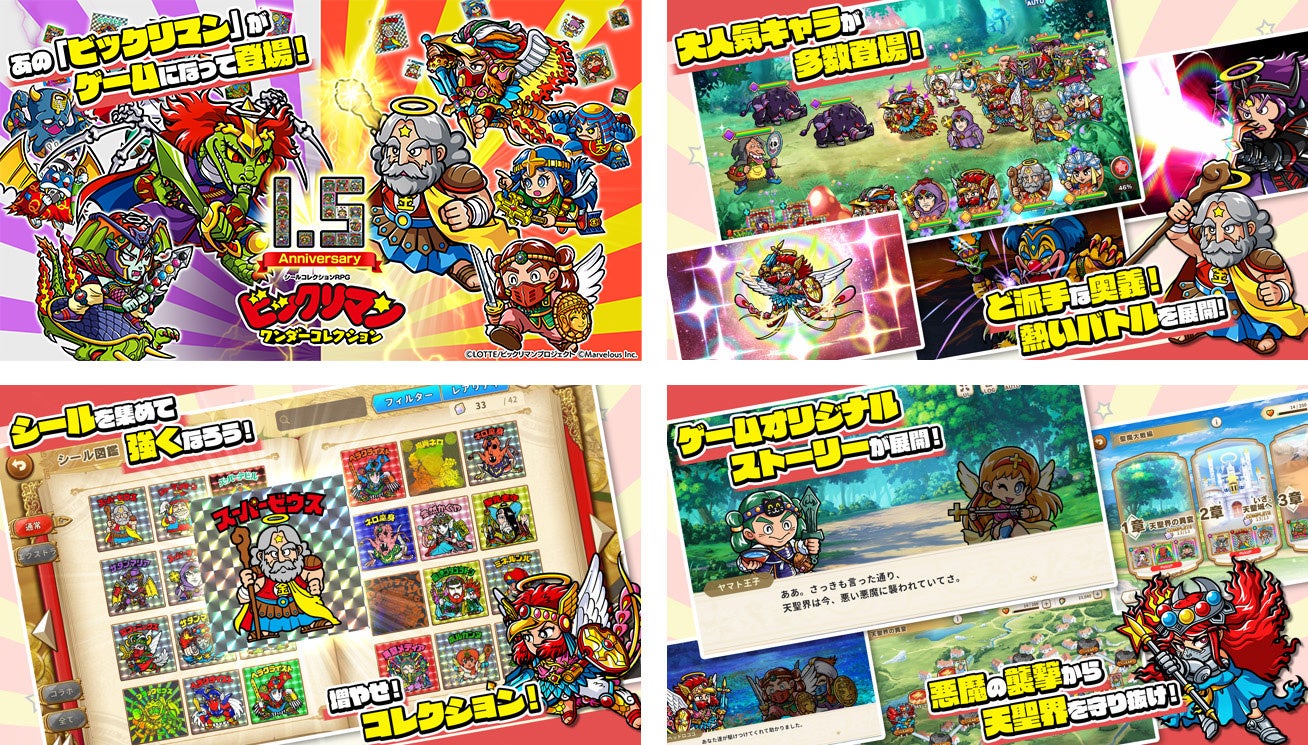 『ビックリマン・ワンダーコレクション』は、ガチャやミッションで入手したキャラクターやシールを強化し、アプリオリジナルのストーリーを進めるRPGです。お馴染みのシールのキャラクターたちが、敵味方入り交じって賑やかに動き回る様を楽しめます。戦闘や編成をオートで楽しむも良し、敵の弱点属性に合わせた編成を試したり、奥義をタイミング良く発動させたりして楽しんでね!さあ、ビックリマンの世界へ冒険に出かけよう!