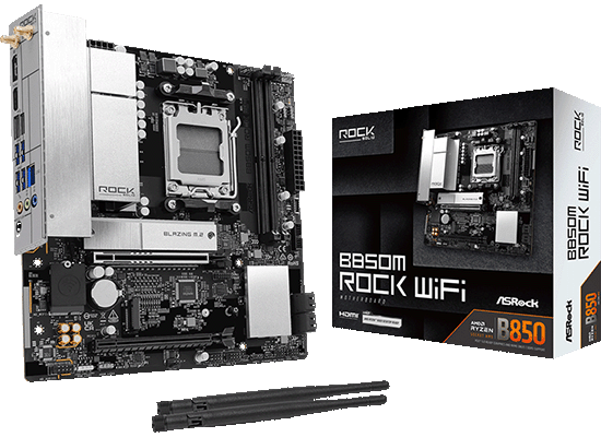 B850 Rock WiFi7は、Socket AM5 AMD B850 ATX WiFi+Bluetoothモジュール付属のマザーボードにゃ。オーバークロックをサポートし、エネルギー効率の高い8層基板を採用。DDR5 XMP、EXPOに対応し、ゲームも仕事もスムーズにするPCIe Gen5 x4 M.2 スロットを搭載しているにゃ。WiFi7+Bluetoothモジュールで接続も完璧!
