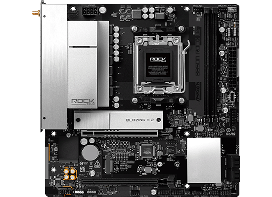 B850M Rock WiFiは、MicroATXフォームファクターながら、その性能はミニマルじゃないにゃ。エネルギー効率を考慮した6層基板に、DDR5メモリ、PCIe Gen5 x4 M.2 スロットを搭載し、快適なWiFi6+Bluetoothモジュール付きで接続性も抜群。スペースが限られている方にも最適だにゃ。