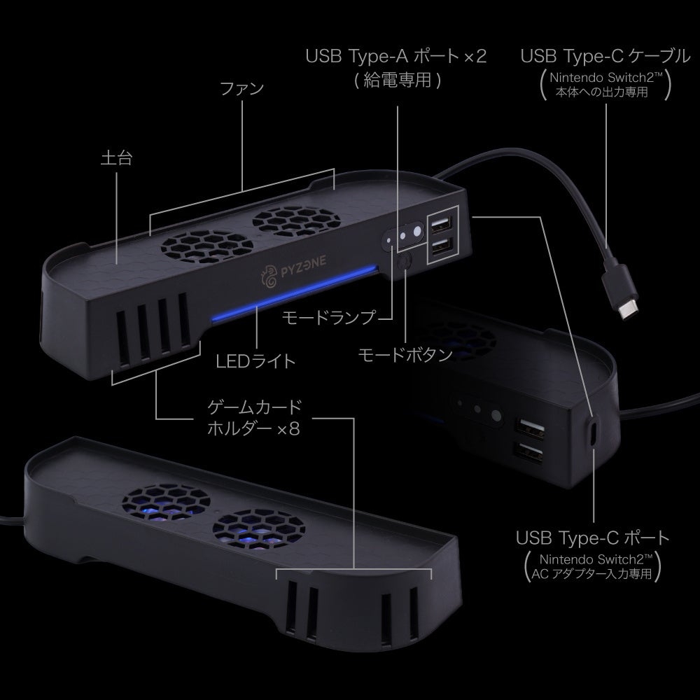 本製品は、Nintendo Switch2のドック専用に設計されており、吸気を強力にサポートするアイテムです。内部ファンがドック下部の吸気口にピンポイントで風を送り、熱のこもりを防ぎます。設置も簡単で、工具不要なのが嬉しいポイントにゃ。また、ゲームカードを最大8枚収納できるので、整理整頓もバッチリ!